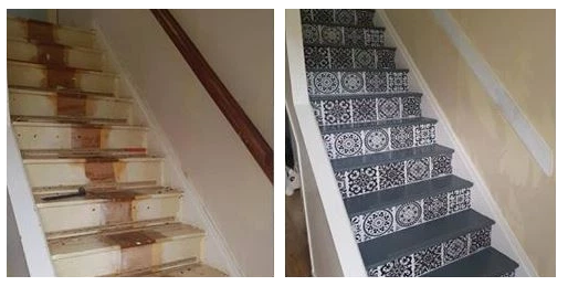 “It was too expensive to replace the carpet and pay a fitter, so I did this myself instead. It’s so much easier to clean now. £30 for paint (Leyland trade heavy duty floor paint in slate) £20 vinyl kickboard stickers eBay) transparent non slip stair grips £15 (Amazon).”