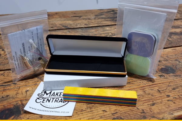 Complete with; A pen blank, Mini 30 Cal Blot Action Pen Kit, Acrylic & Corian Finishing Kit, A suede pen box and a HowTo Sticker for good measure!